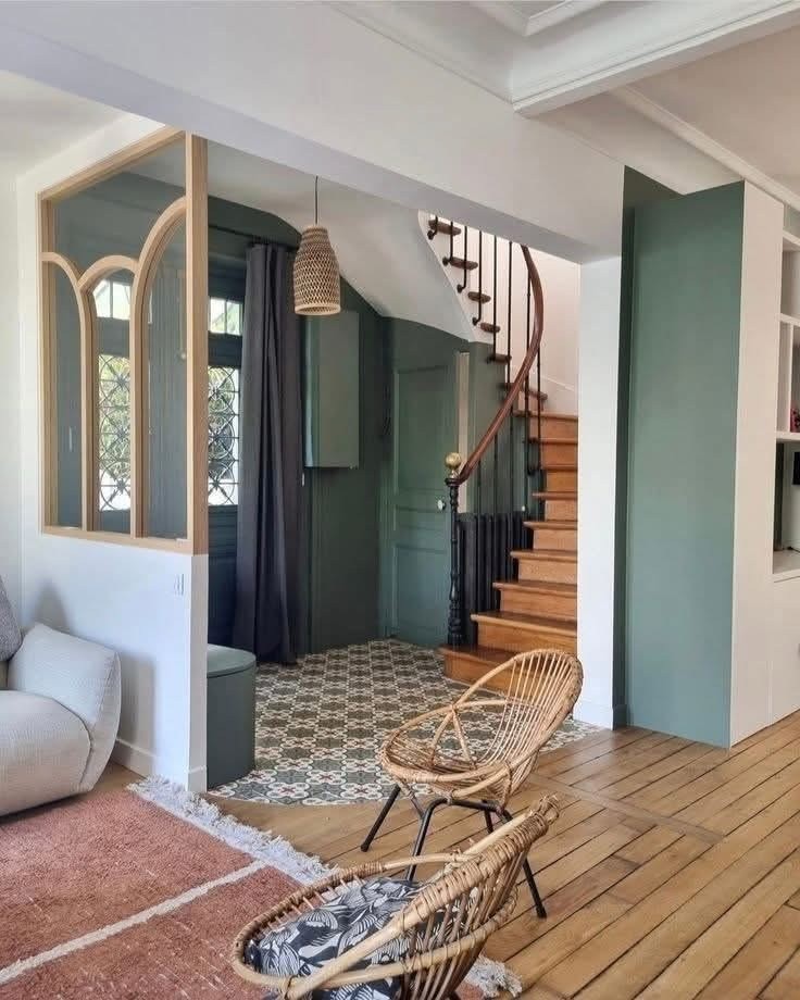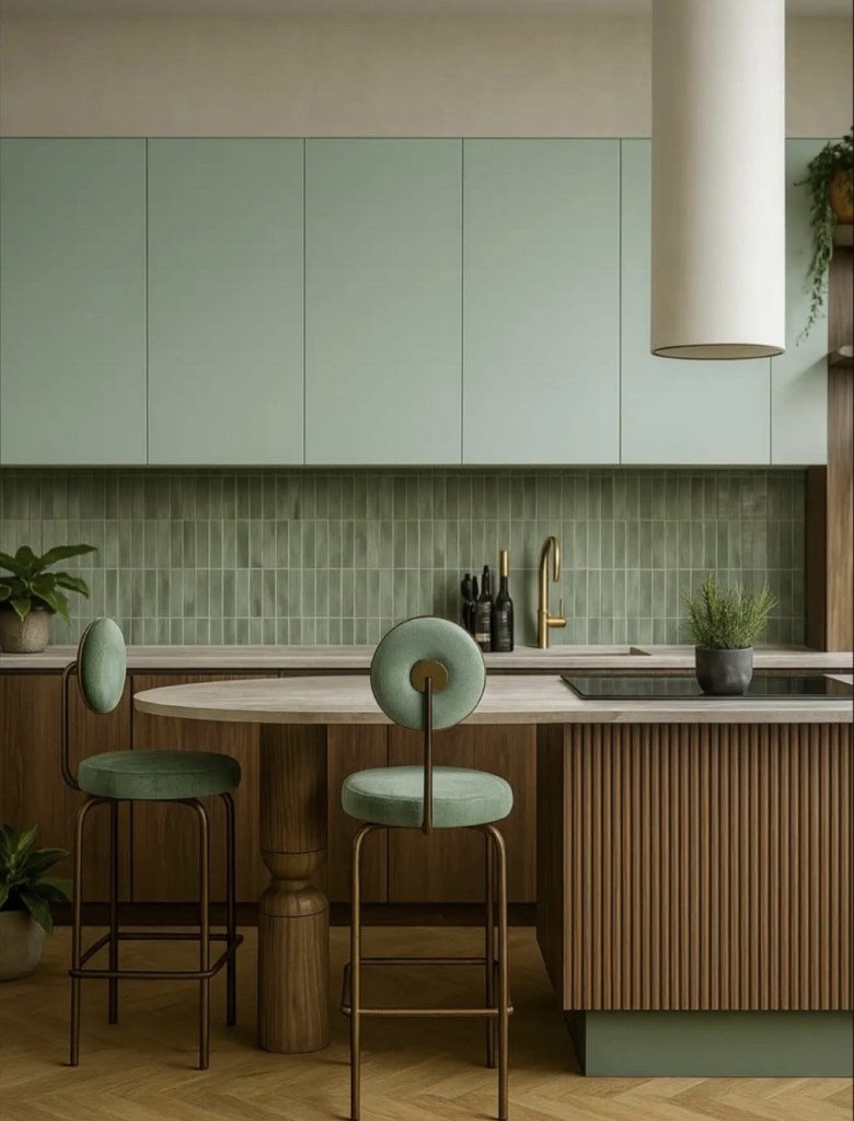 Cuisine noyer et tons verts su les meubles hauts et le zellige